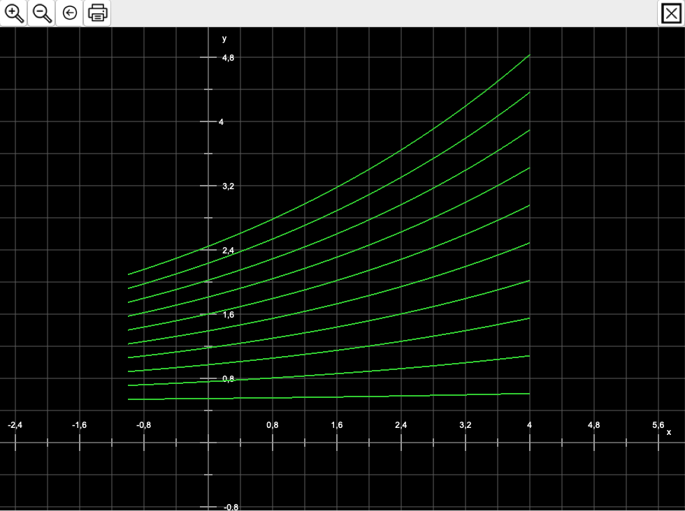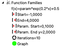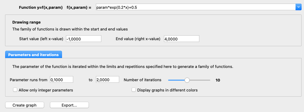 In the Parameters and iterations area, you can specify how the parameter is to be varied and how many functions are to be drawn (maximum 20). If the checkbox Allow only integer parameters is activated, only the lower parameter value can be changed – the upper value adjusts automatically based on the number of iterations selected.