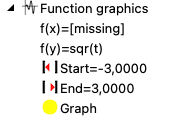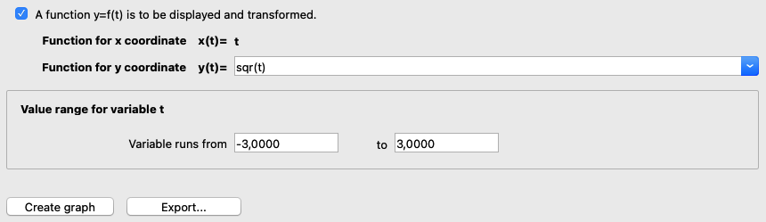 In addition to the transformation functions for the coordinate system, the mapping functions for the graphics must also be selected. For better differentiation, only functions containing the variables t and param are permitted. Enter the desired functions in the input field for the functions, or select one of the existing functions by clicking on the arrow to the right of the respective input field. A checkbox allows the abbreviated entry of only one function if no curve x(t) and y(t) is to be displayed, but only one function y = f(t). In addition, the value range for the variable t can be selected.