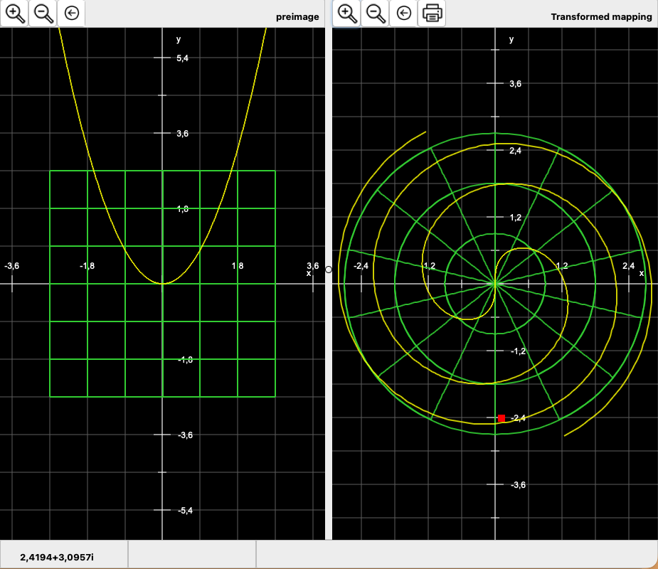 In the example, a quadratic parabola is transformed into a polar coordinate system. The grid display of the transformation basis is set to transparent for a better overview.