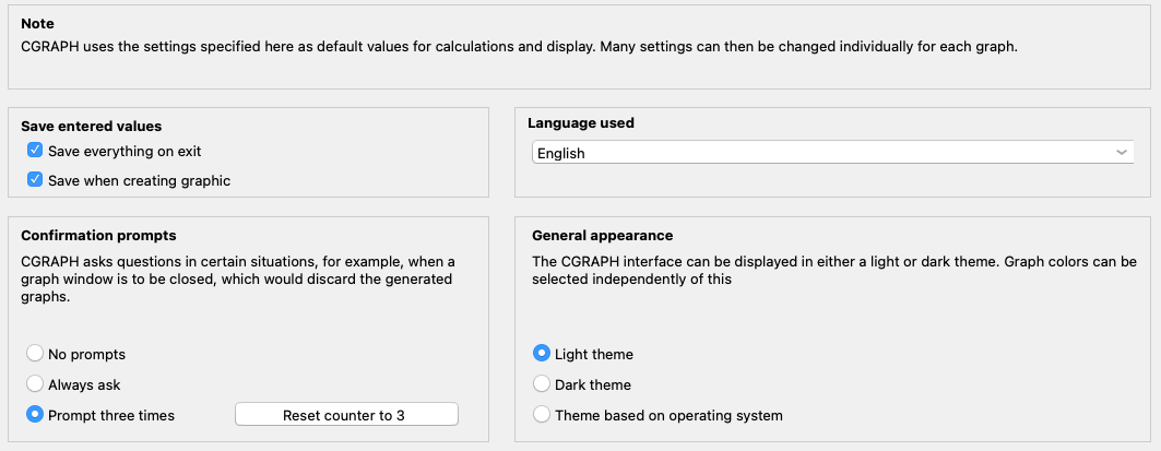 In the Save entered values section, you can specify whether these values should be saved once when exiting or every time graphics are created. Every change to the input values for the graphics is saved. If both switches are deactivated, CGRAPH permanently retains the numerical values that are loaded at start-up.