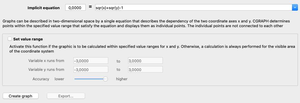 The Accuracy slider is only active if you have set your own Value range. While CGRAPH checks the result of the equation using the value ranges for x and y, all values that are closer to zero than the accuracy set here are valid results. Depending on the size of the graph and its relationship to the set value range, it may be necessary to readjust here if too few or too many results are displayed.