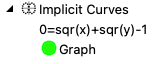 For implicit curves, the availability of variable names in the function editor is limited to x and y. The parameter param is also permitted. Enter the desired term in the input field for the equation, or select one of the existing terms by clicking on the arrow to the right of the input field. The sum of the term is assumed to be zero. If you want to use an equation of the form f(x,y) = a, you must transform the term to f(x,y) - a so that the equation equals zero.