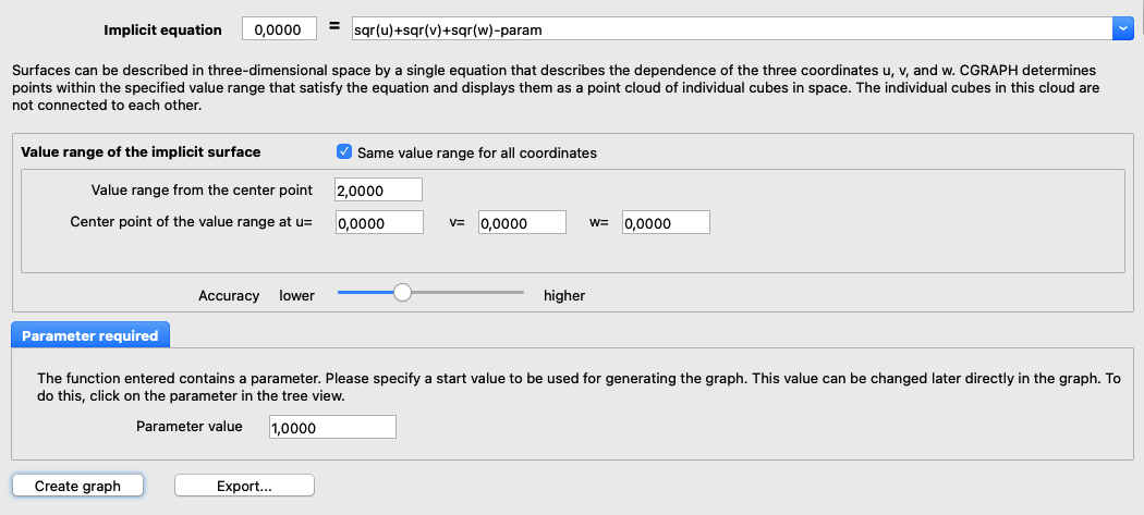 CGRAPH determines the values for u, v, and w for implicit surfaces within the specified values. Optionally, uniform values can be used for all three coordinates, starting from a centre point, if the Same value range for all coordinates field is selected.
