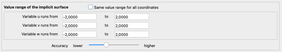If the Same value range for all coordinates field is not selected. individual value ranges can be specified for u, v and w, within which the implicit equation is examined.