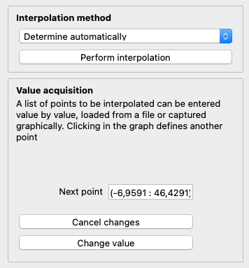 After clicking on the Execute interpolation button, CGRAPH calculates (automatically, if desired) the coefficients of the (best) interpolation method and switches to the graphical representation.