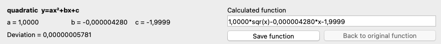 The display of the coefficients depends on the interpolation method. In the example, there are three coefficients a, b and c for a quadratic parabola. The determined function is displayed in the right-hand area. It can be edited; the result is then immediately visible in the graphic. In this way, the function can be further adjusted to the individual values.