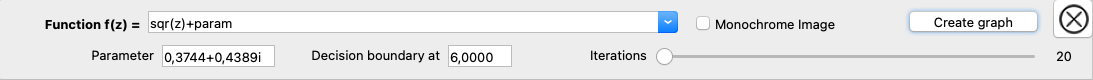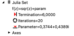 The image shows a Julia set of the function f(z)= z2 + param. The default values can be viewed in the tree on the left. Since the starting point is part of the graphic function here, only the parameter can be changed. An explanation of how to change the parameter graphically can be found in the notes on changing the parameter in the graphic display.