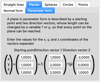 A plane in parameter representation has a starting point and two independent direction vectors. They can be entered separately for the x, y and z coordinates in the Planes/Parameter Form tab. Clicking on the Add to List button then displays the plane in the right-hand window. A check is performed to see whether the plane is already part of the list. CGRAPH also recognises entries that do not have exactly the same definition (e.g. a different starting point) but still describe the same plane.