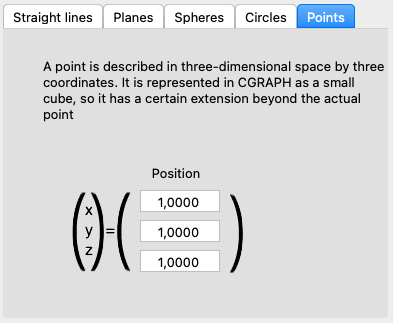 A point is described by its position vector (x/y/z). The position vector can be entered (separately for x, y and z coordinates) in the Points tab. Clicking on the Add to list button then displays the point in the right-hand window. A check is performed to see whether the point is already part of the list.