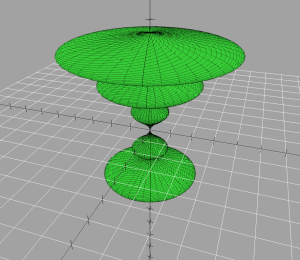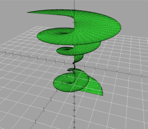 The three graphics show the same image with the functions fx=w*cos(v)*sin(u) and fy=w*sin(v)*sin(u) – both together form a surface circle – and the function fz=w, in which the z-coordinate is simply increased from support value to support value. In the first image, w remains unchanged when u and v are increased, resulting in a number of stacked circular planes (here 5, because the number of support values has been set to 5). If, as in the middle image, w is increased with v, a screw is created. In the third image, w is increased with u, resulting in paraboloids.