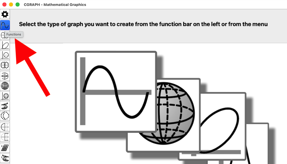 On the left-hand side is a toolbar from which all graphing functions can be accessed. If you hover the mouse pointer over one of the buttons, a tooltip appears showing the name of the graphing function. All graphics functions available in CGRAPH are listed here, and can also be found in the menu