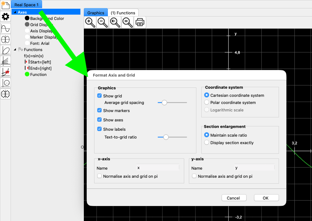 The tree on the left-hand side always displays the respective default settings for the graphs, but it also allows you to change the display. If you double-click on the text ‘Function’ (green arrow), a window appears for visual adjustment of the graph.
