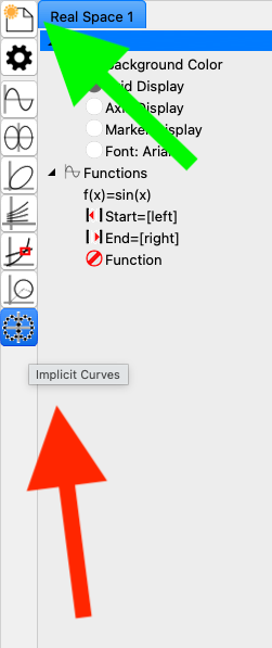 The window contents now change. On the left (green arrow), a tree appears in which all the contents of a graph are listed and where their colours and appearance can be changed. In the right-hand pane, a window appears containing the default values for the graphing function (red arrow). Furthermore, the function bar on the left-hand side is restricted to all graphing functions that can later be displayed in the same graph window. All others are hidden.