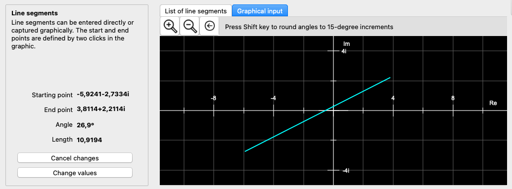 In CGRAPH, line segments, i.e. lines with defined start and end points, can be mapped onto the complex plane. Either the end point or the length and angle of the line segment can be specified.