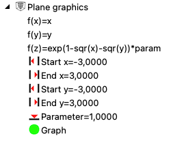 In addition to the transformation functions for the coordinate system, the mapping functions for the graphics must also be selected. For better differentiation, only functions containing the variables x, y and param are permitted. Enter the desired functions in the input field for the functions, or select one of the existing functions by clicking on the arrow to the right of the respective input field. A checkbox allows you to enter only one function if you only want a mapping of the form z = f(x,y). In addition, the value range for the variables x and y can be selected.
