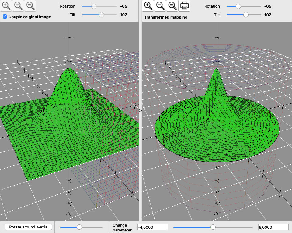 In the example, a Gaussian bell curve is transformed into a polar coordinate system, the description of which can be found in the transformation basis. The grid representation of the transformation basis is switched to transparent for a better overview.