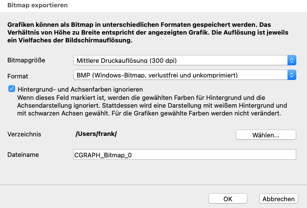 CGRAPH kann Grafiken nicht nur drucken, sondern auch hochauflösend exportieren. Diese Funktion ist ausschließlich über das Menü Ablage/Export unter macOS oder Datei/Export unter Windows verfügbar.
