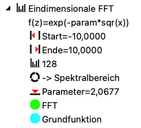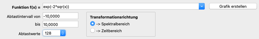Anders als bei anderen Grafiken sind hier Vorgaben und Grafik im selben Fenster untergebracht, Es kann das Abtastintervall eingesrtellt werden. Die Abtastwerte sind auf Potenzen von 2 beschränkt. Neben der Fouriertransformation in den Spektralbereich ist auch die Rücktransformation in den Zeitbereich möglich.