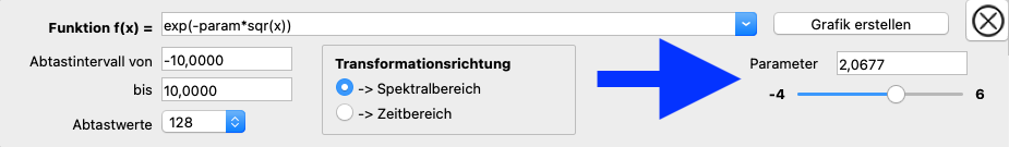Anders als bei anderen Grafiken wird ein (optionaler) Parameter hier über einen Schieberegler unterhalb des Parameters im Vorgabebereich eingestellt (blauer Pfeil). Sie können den Parameter auch im Vorgabenbereich als Zahl eingeben und verändern.