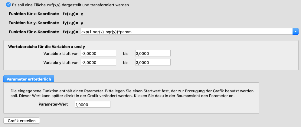 Dazu müssen zusätzlich zu den Transformationsfunktionen für das Koordinatensystem die Abbildungsfunktionen für die Grafik gewählt werden. Zur besseren Unterscheidung sind nur Funktionen zulässig, die die Variablen x, y und param enthalten. Geben Sie im Eingabefeld für die Funktionen die gewünschten Funktionen ein, oder wählen Sie eine der bereits vorhandenen Funktionen durch Klick auf den Pfeil rechts vom jeweiligen Eingabefeld. Eine Checkbox erlaubt die verkürzte Eingabe nur einer Funktion, falls lediglich eine Abbildung der Form z = f(x,y) gewünscht ist. Zudem kann der Wertebereich für die Variablen x und y gewählt werden.