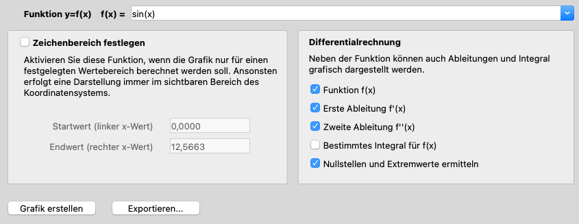 Der Schalter Export erlaubt die Erstellung einer Datei im Semikolon-getrennten CSV-Format; es werden die x- und die zugehörigen Funktionswerte exportiert. Sofern nicht nur die Funktion, sondern auch Ableitungen oder das Integral gezeichnet werden, werden auch diese in getrennten Dateien exportiert.