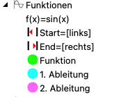 Es können zudem auch Nullstellen und Extremwerte der Funktion eingezeichnet werden. Die Darstellung erfolgt mittels kleiner Quadrate um den jeweiligen Punkt, die in derselben Farbe gehalten sind wie der zugehörige Graph - Nullstellen in der Farbe der Funktion, Extremwerte in der Farbe der ersten Ableitung und Wendepunkte in der Farbe der zweiten Ableitung.