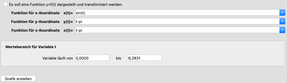 Dazu müssen zusätzlich zu den Transformationsfunktionen für das Koordinatensystem die Abbildungsfunktionen für die Grafik gewählt werden. Zur besseren Unterscheidung sind nur Funktionen zulässig, die die Variablen t und param enthalten. Geben Sie im Eingabefeld für die Funktionen die gewünschten Funktionen ein, oder wählen Sie eine der bereits vorhandenen Funktionen durch Klick auf den Pfeil rechts vom jeweiligen Eingabefeld. Eine Checkbox erlaubt die verkürzte Eingabe nur einer Funktion, falls kein Kurvenverlauf x(t) und z(t), sondern nur eine Funktion y = f(t) dargestellt werden soll. x((t) wird dann zu t, zTT) zu 0 gesetzt, es entsteht also eine Funktion in der u-v-Ebene. Zudem kann der Wertebereich für die Variable t gewählt werden.