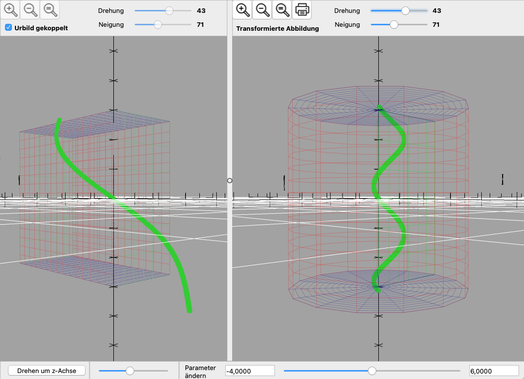 Neben der grafischen Darstellung von Raumkurven können deren Graphen zusätzlich auch koordinatentransformiert werden. CGRAPH bildet dabei die kartesische Darstellung im transformierten 3D-Koordinatensystem ab.
