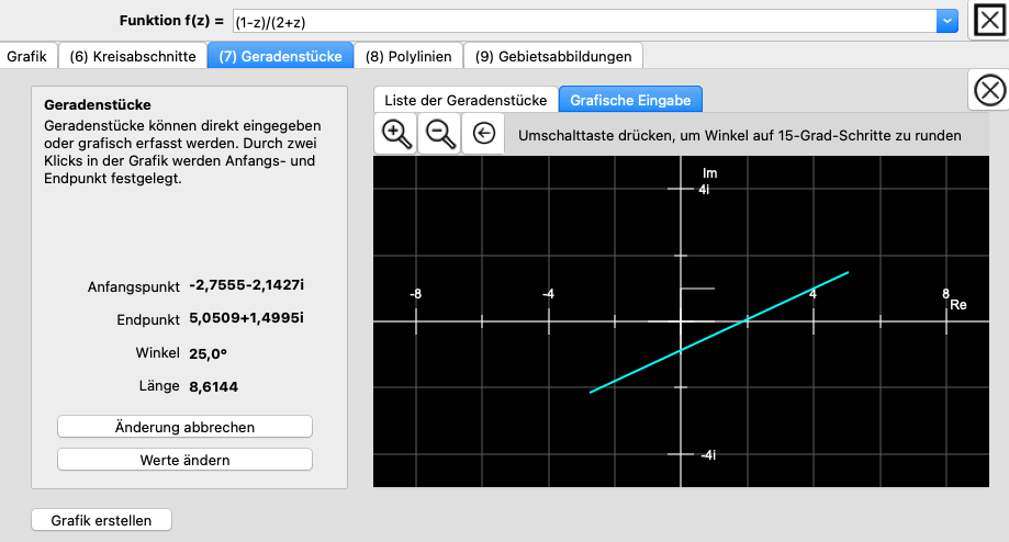 In CGRAPH können Geradenstücke, Geraden mit definiertem Anfangs- und Endpunkt über der komplexen Ebene abgebildet werden. Wahlweise kann dabei der Endpunkt oder Länge und Winkel des Geradenstücks vorgegeben werden.
