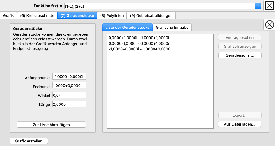 Über den Schalter Zur Liste hinzufügen werden die Eingaben in die Liste der Geradenstücke Abbildungen übernommen.