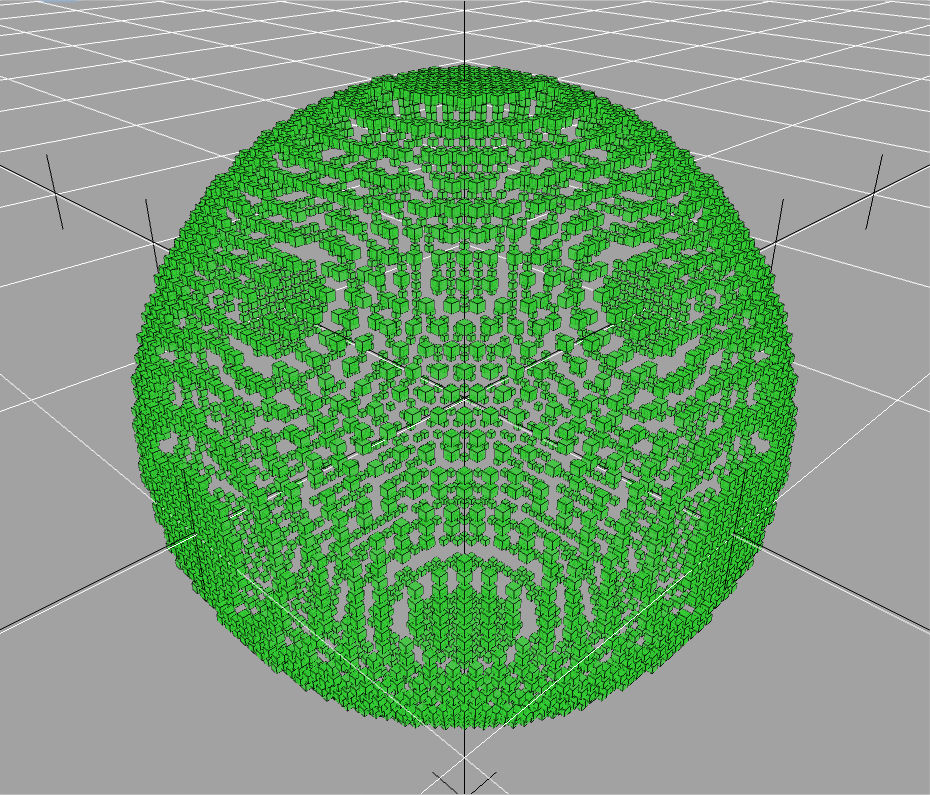 Nach dem Anklicken des Schalters Grafik erstellen schaltet CGRAPH auf den Reiter Darstellung um und zeigt die Grafik. Die berechneten Punkte werden als kleine Würfel in einheitlicher Größe dargestellt. Aufgrund der 3D-Ansicht erscheinen daher weiter hinten liegende Würfel kleiner als die im Vordergrund liegenden.