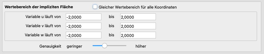 Wenn das Feld Gleicher Wertebereich für alle Koordinaten nicht markiert ist. können für u, v und w jeweils einzelne Wertebereiche festgegelgt werden, innerhalb derer die implizite Gleichung untersucht wird.