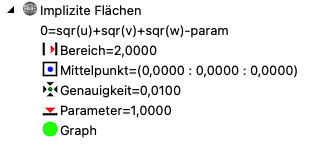 Bei impliziten Flächen ist die Verfügbarkeit von Variablennamen im Funktioneneditor auf u, v und w beschränkt. Zulässig ist auch noch der Parameter param. Geben Sie im Eingabefeld für die Gleichung den gewünschten Term ein, oder wählen Sie einen der bereits vorhandenen Terme durch Klick auf den Pfeil rechts vom Eingabefeld. Die Summe des Terms wird als Null angenommen. Wenn Sie eine Gleichung der Form f(u,v,w) = a verwenden wollen, müssen Sie den Term umformen nach f(u,v,w) - a, damit die Gleichung Null ergibt.