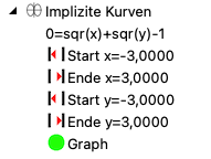 Bei der hier gezeigten Gleichung handelt es sich um einen einfachen Kreis um den Nullpunkt herum mit dem Radius 1. Die Vorgabewerte können nachträglich geändert werden - durch einen Klick auf einen der Werte schaltet CGRAPH wieder auf den Reiter mit den Vorgabewerten um. Eine Anpassung der Grafik erfolgt, sobald der Schalter Grafik erstellen angeklickt wird. Ein Klick auf das farbige Symbol für den Graph erlaubt das schnelle Ausblenden der Grafik aus der Darstellung. Ein Doppelklick auf den Text erlaubt die Anpassung der grafischen Darstellung.