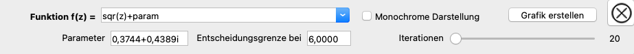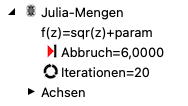 Das Bild zeigt eine Juliamenge der Funktion f(z)= z2 + param. Im Baum auf der linken Seite können die Vorgabewerte eingesehen werden. Da der Startpunkt hier Teil der Grafikfunktion ist, kann nur der Parameter geändert werden. Eine Erklärung zur grafischen Änderung des Parameters finden Sie bei den Hinweisen zur Änderung des Parameters in der Grafikdarstellung.