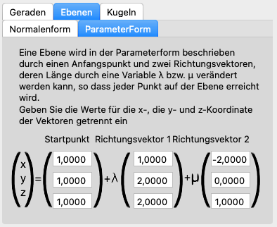 Eine Ebene in Parameterdarstellung besitzt einen Startpunkt und zwei unabhängige Richtungsvektoren. Sie können getrennt für x-, y und z-Koordinate im Reiter Ebenen/Parameterform eingegeben werden. Ein Klick auf den Knopf Zur Liste hinzufügen zeigt die Ebene dann im rechten Fenster an. Es wird dabei eine Prüfung vorgenommen, ob die Ebene bereits Teil der Liste ist. CGRAPH erkennt dabei auch Angaben, die nicht exakt dieselbe Definition haben (bspw. einen anderen Startpunkt), aber dennoch dieselbe Ebene beschreiben.