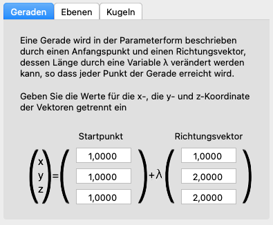Eine Gerade in Parameterdarstellung besitzt einen Startpunkt und einen Richtungsvektor. Beide können getrennt für x-, y- und z-Koordinate im Reiter Geraden eingegeben werden. Ein Klick auf den Knopf Zur Liste hinzufügen zeigt die Gerade dann im rechten Fenster an. Es wird dabei eine Prüfung vorgenommen, ob die Gerade bereits Teil der Liste ist. CGRAPH erkennt dabei auch Angaben, die nicht exakt dieselbe Definition haben (bspw. einen anderen Startpunkt), aber dennoch dieselbe Gerade beschreiben.