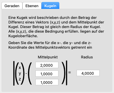 Eine Kugel wird beschrieben durch den Betrag der Differenz eines Vektors (x/y/z) und dem Mittelpunkt der Kugel. Für alle (x/y/z) auf der Kugel ist dieser Betrag gleich dem Radius der Kugel. Der Radius und der Vektor(getrennt für x-, y- und z-Koordinate) können im Reiter Kugeln eingegeben werden Ein Klick auf den Knopf Zur Liste hinzufügen zeigt die Kugel dann im rechten Fenster an. Es wird dabei eine Prüfung vorgenommen, ob die Kugel bereits Teil der Liste ist.
