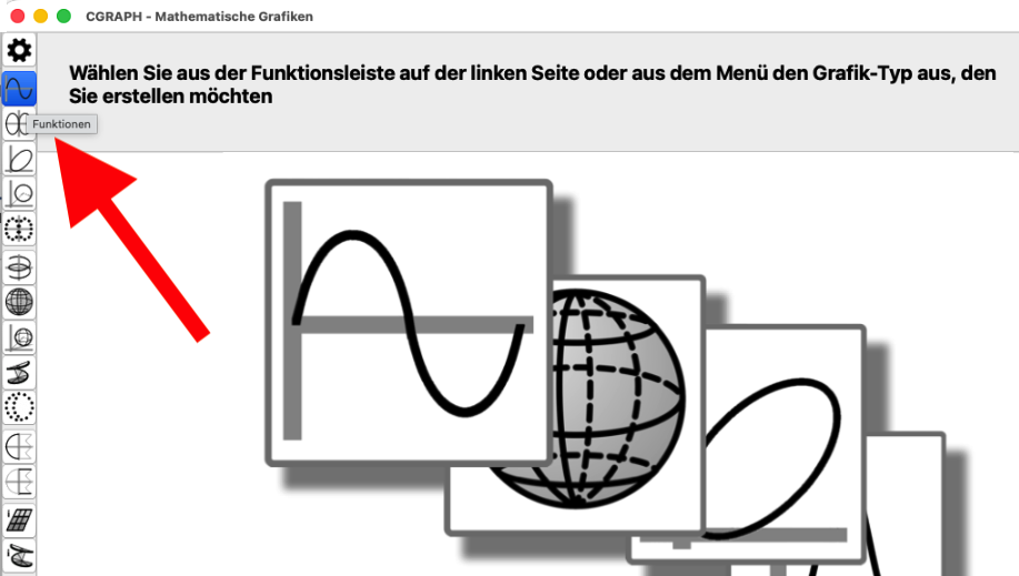 In diesem Beispiel soll eine Sinuskurve gezeichnet werden; dafür bietet CGRAPH den Grafiktyp Funktionen. Das ist in der Funktionenleiste der Schalter, der hier im Bild blau unterlegt ist.