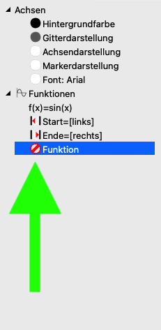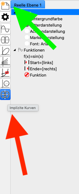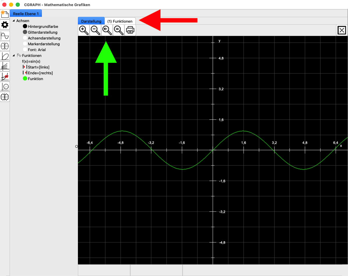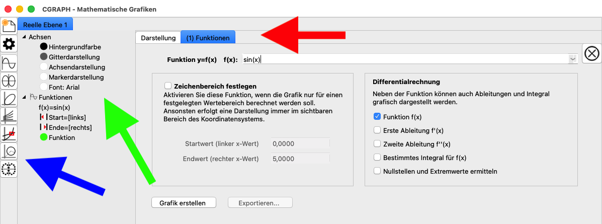 Nun ändert sich der Fensterinhalt. Links (grüner Pfeil) erscheint ein Baum, in dem grundsätzlich alle Inhalte einer Grafik aufgelistet werden und auch deren Farben und Erscheinung geändert werden kann. Im rechten Bereich erscheint ein Fenster, das die Vorgabewerte für die Grafikfunktion enthält (roter Pfeil). Außerdem wird die Funktionenleiste am linken Rand beschränkt auf alle Grafikfunktionen, die später im selben Grafikfenster dargestellt werden können. Alle anderen werden ausgeblendet.