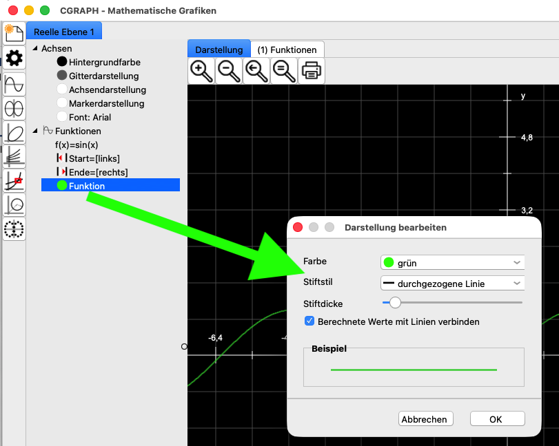 Der Baum auf der linken Seite zeigt immer die jeweiligen Vorgabewerte der Grafiken an, er erlaubt aber auch ein Verändern der Darstellung. Wenn Sie auf den Text Funktion doppelt klicken (grüner Pfeil), erscheint ein Fenster zur visuellen Einstellung der Grafik.