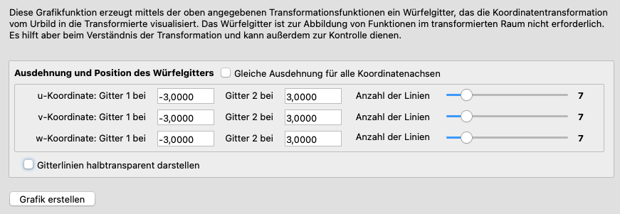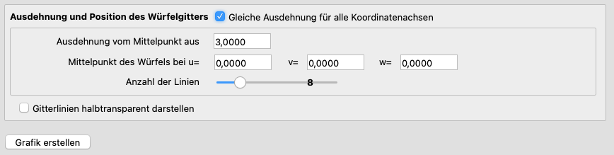 Im unteren können Bereich zudem die Ausdehnung und Position des Würfelgitters für die Variablen u, v und w sowie über die Schieberegler die Anzahl der Linien der Gitterseiten gewählt werden.
